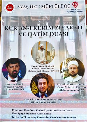 Camiler ve Din Görelleri Haftası sebebiyele ilçemiz Bünyamin Âyaşi Camiinde 09 Ekim 2025 tarihinde yatsı namazı sonrasında Kur'an Ziyafeti programı düzenlenecektir. Tüm halkımız daveitlidir.
