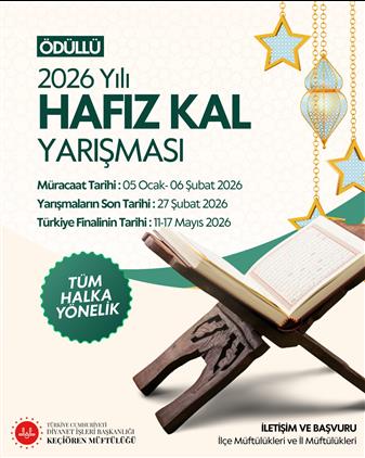 Başkanlığımız Mushafları İnceleme ve Kıraat Kurulunca hafızlık müessesesinin korunmasına katkı sunmak ve daha önce hafızlık yapmış, farklı sebeplerle hıfzını zayıflatmış vatandaşlarımızın hafızlıklarını pekiştirmelerine yardımcı olmak amacı ile 2026 yılında, Diyanet İşleri Başkanlığında çalışmayan ve Diyanet İşleri Başkanlığından emekli olmamış olan vatandaşlarımıza yönelik hafızlık yarışması düzenlenecektir. Şartları taşıyan vatandaşlarımız, 05 Ocak – 06 Şubat 2026 tarihleri arasında bulundukları yerdeki il/ilçe müftülüğünde başvuru formunu doldurarak müracaat edeceklerdir.