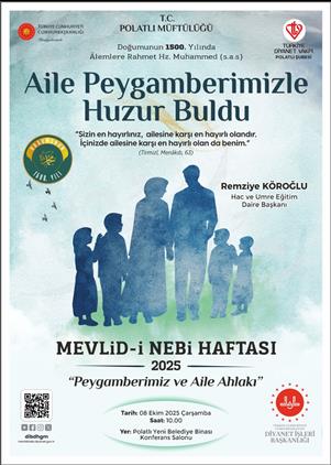 2025 Yılı Mevlid-i Nebi Haftası etkinlikleri kapsamında 08.10.2025 Çarşamba Günü Saat 10.00'da Polatlı Yeni Beldiye Binası Konferans Salonunda konuşmacı olarak DİB Hac ve Umre Eğitim Daire Başkanı Remziye KÖROĞLU'un katılımıyla gerçekleştireceğimiz Mevlid-i Nebi Konferansımıza tüm Bayan halkımız davetlidir.